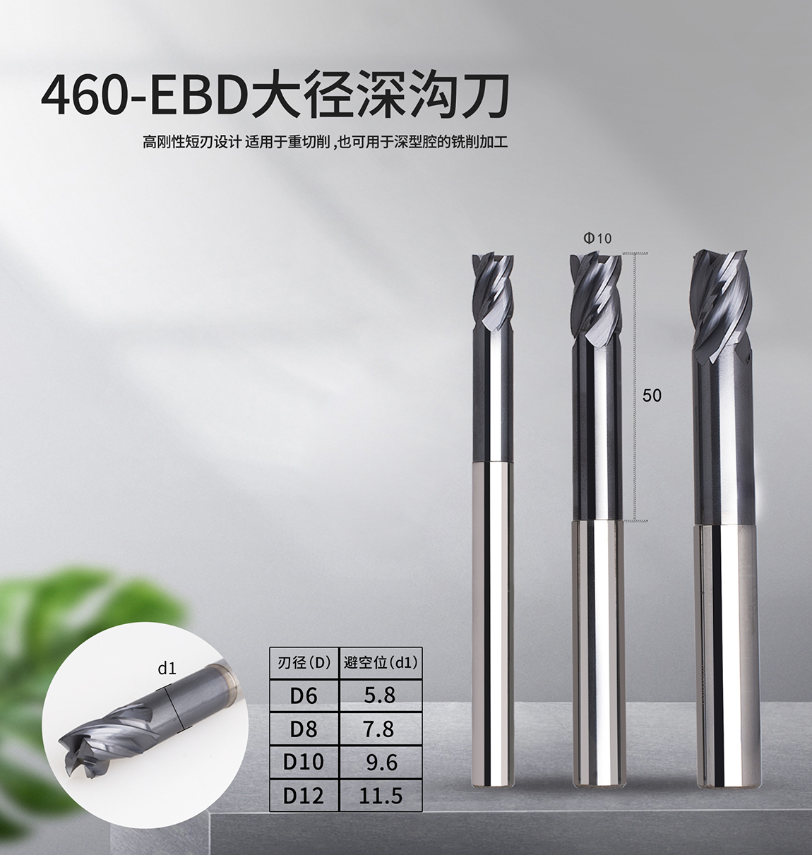 460-EBD大径深沟刀 1、高刚性短刃设计适用于重切削 2、也可用于深型腔的铣削加工