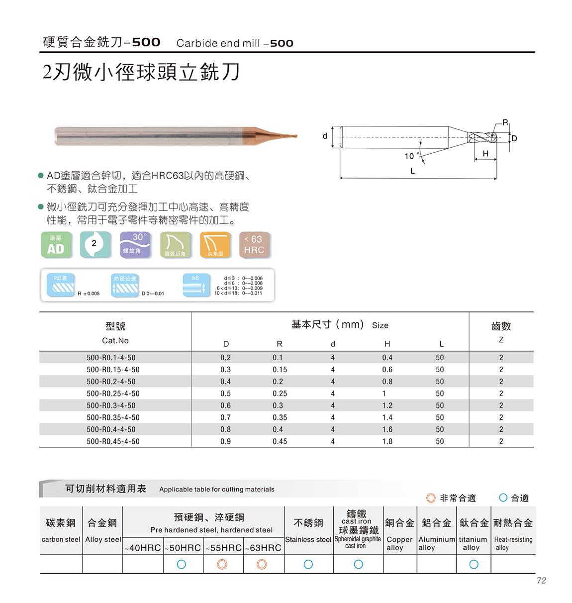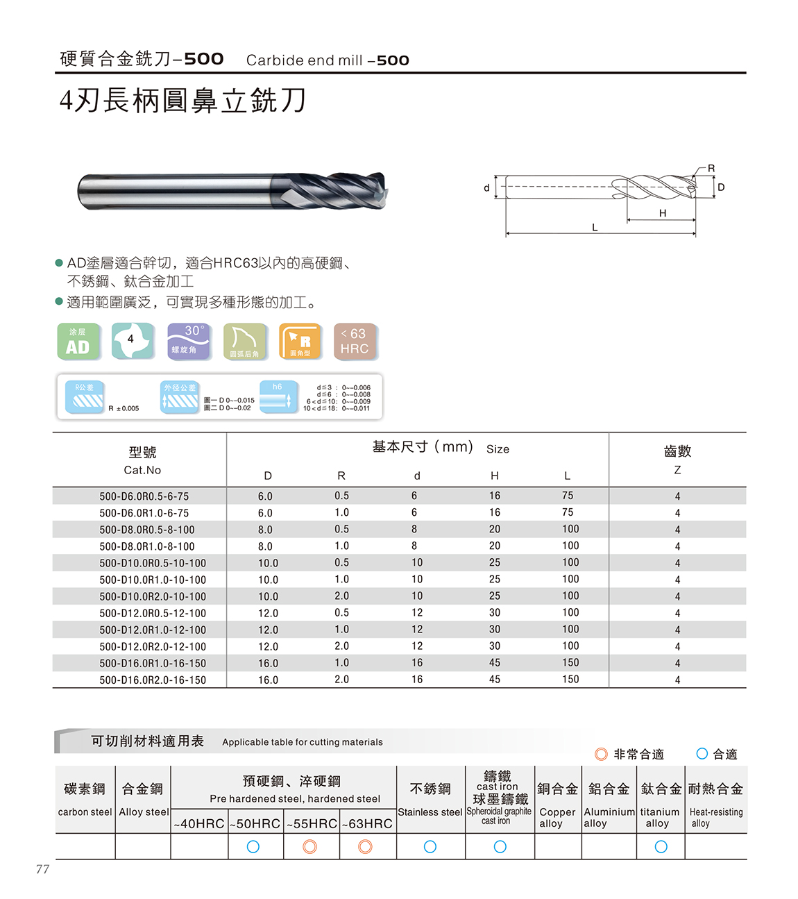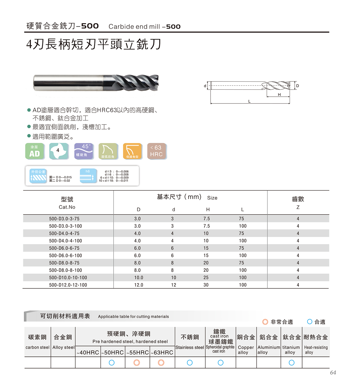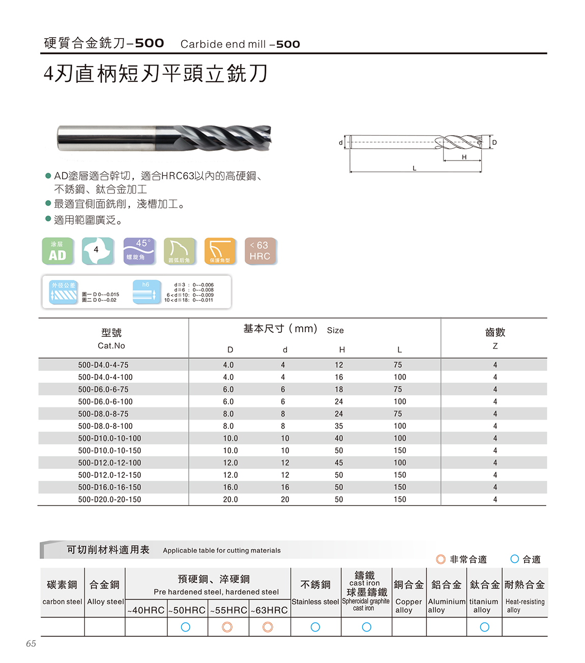 500系列合金刀 1.德国K45材料+瑞士AD涂层,涂层适合干切; 材料含Co13%,具有更高的抗崩性能 2.适合HRC63以内的高硬钢、不锈钢、合金加工 3.45度螺旋角,密齿具有更高的耐磨性,适合高速加工