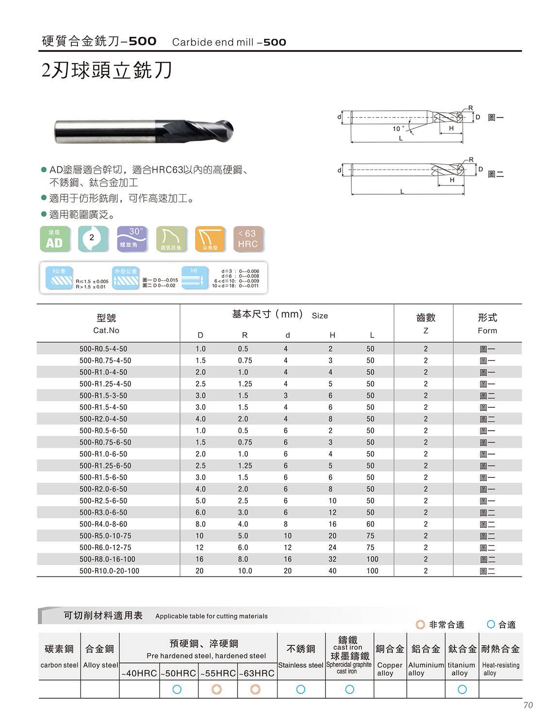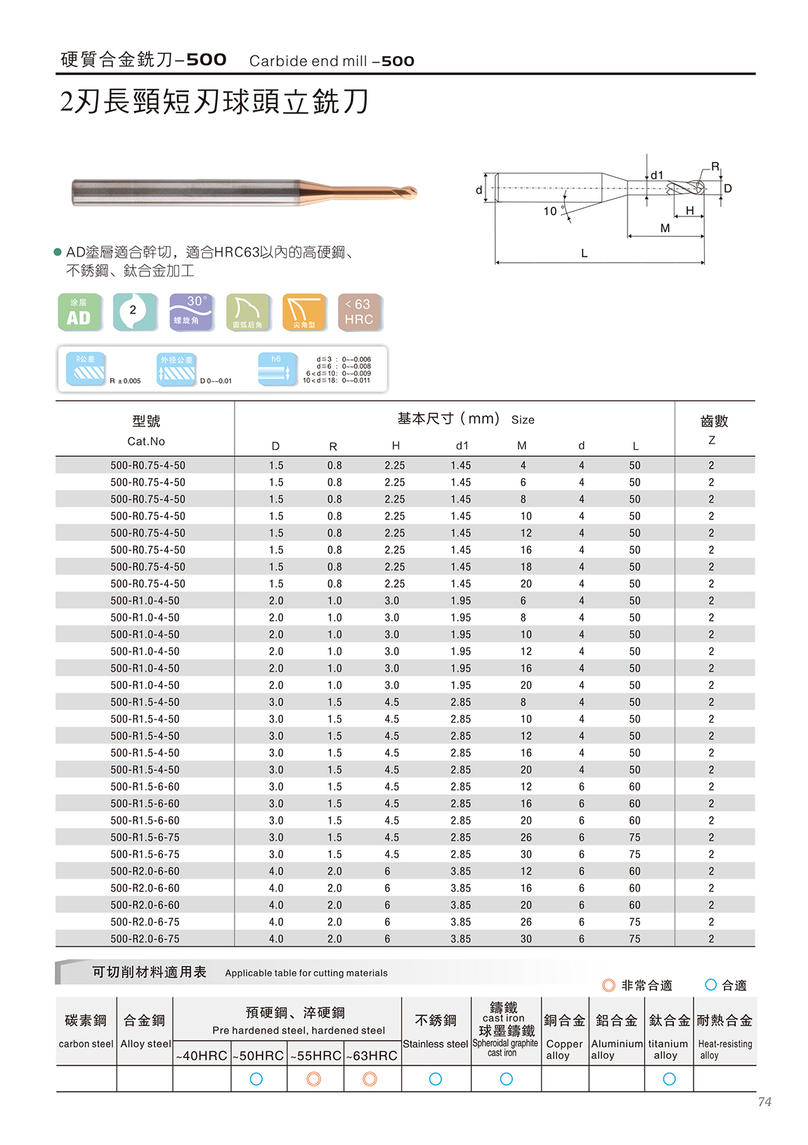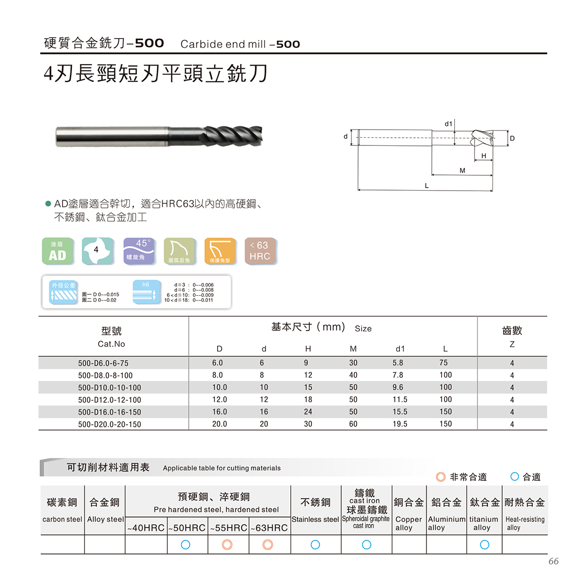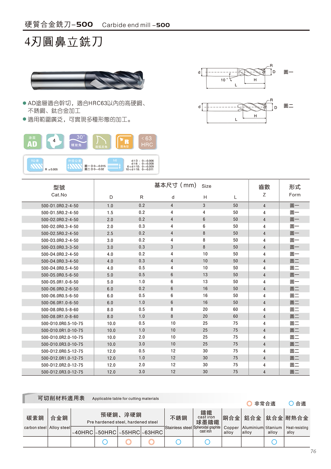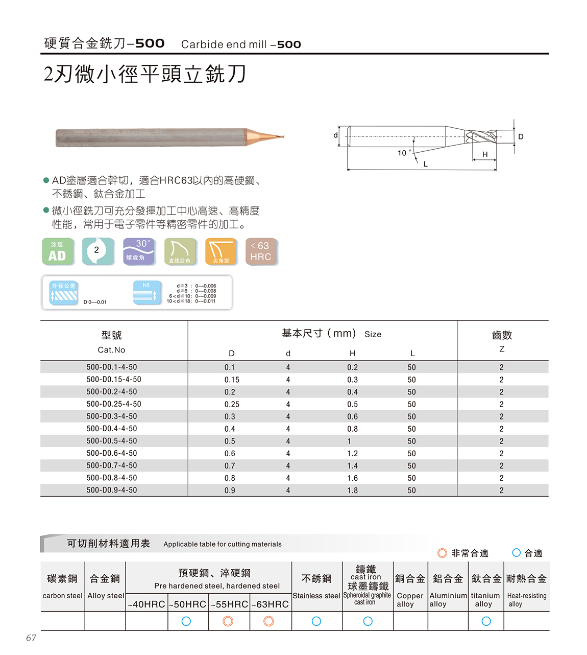 500系列合金刀 1.德国K45材料+瑞士AD涂层,涂层适合干切; 材料含Co13%,具有更高的抗崩性能 2.适合HRC63以内的高硬钢、不锈钢、合金加工 3.45度螺旋角,密齿具有更高的耐磨性,适合高速加工