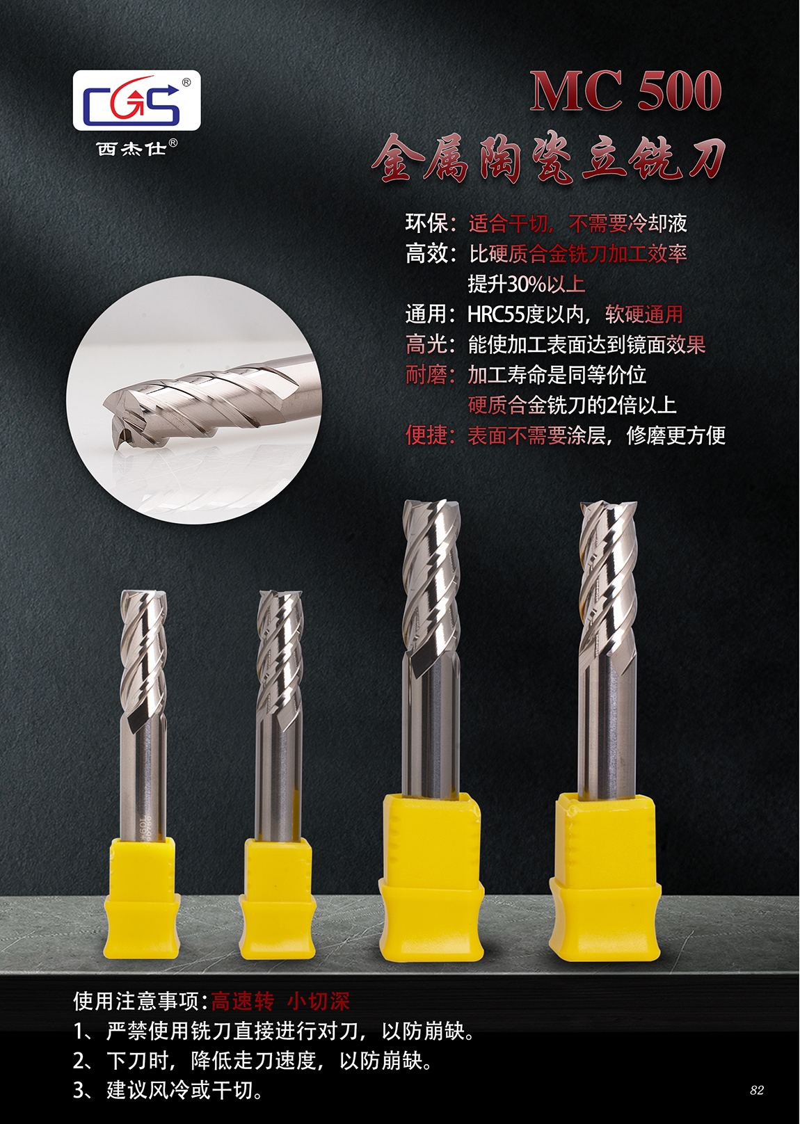 MC 500 金属陶瓷立铣刀 环保:适合干切,不需要冷却液 高效:比硬质合金铣刀加工效率,提升30%以上 通用:HRC55度以内,软硬通用 高光:能使加工表面达到镜面效果 耐磨:加工寿命是同等价位,硬质合金铣刀的2倍以上 便捷:表面不需要涂层,修磨更方便