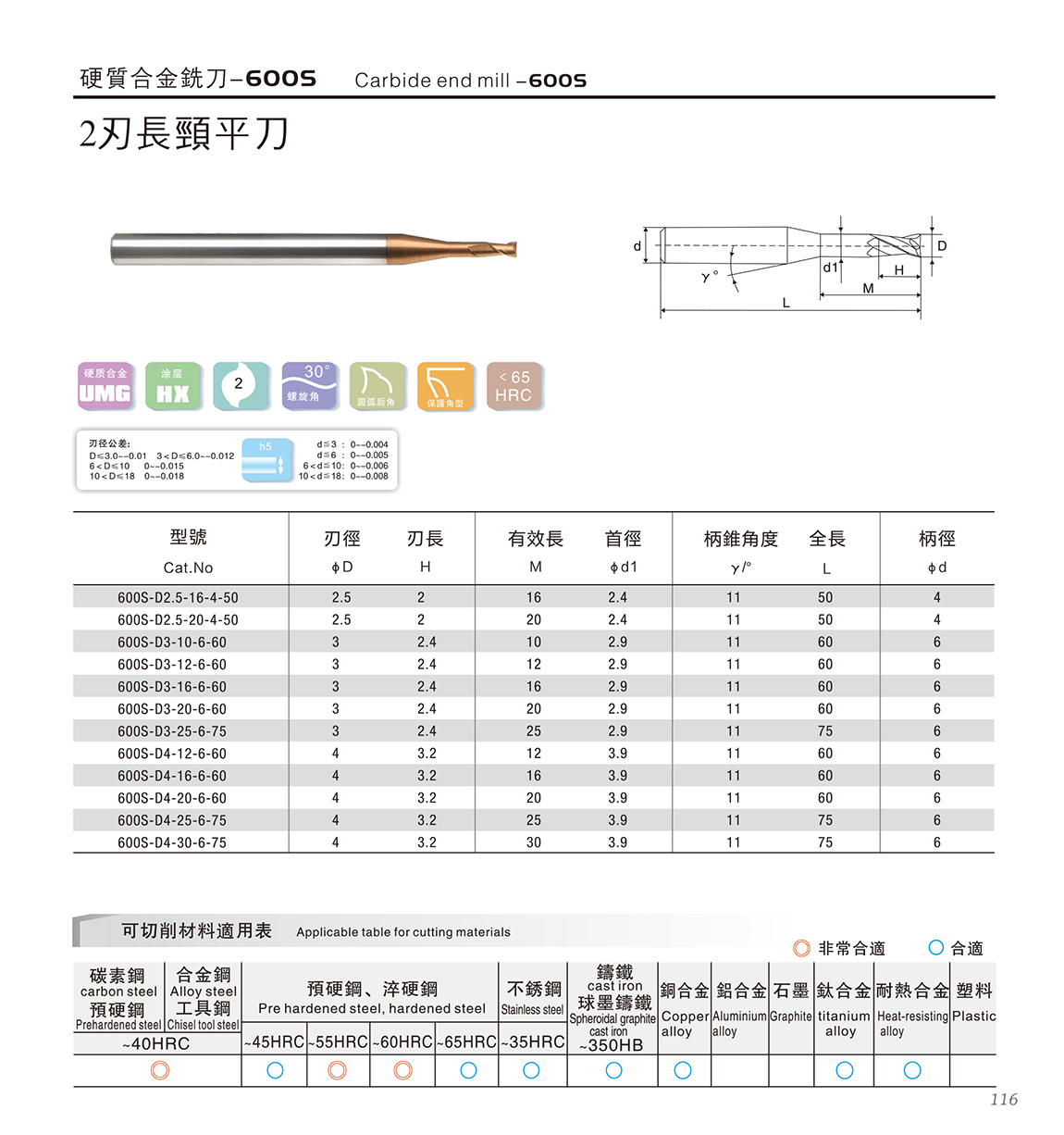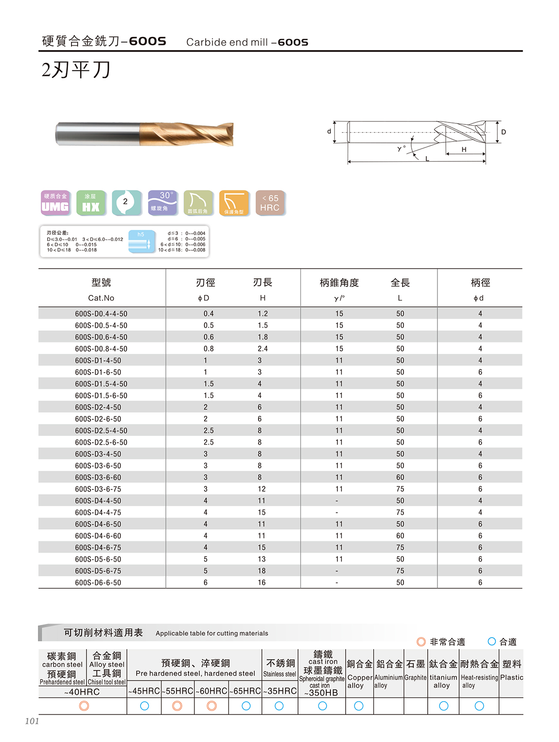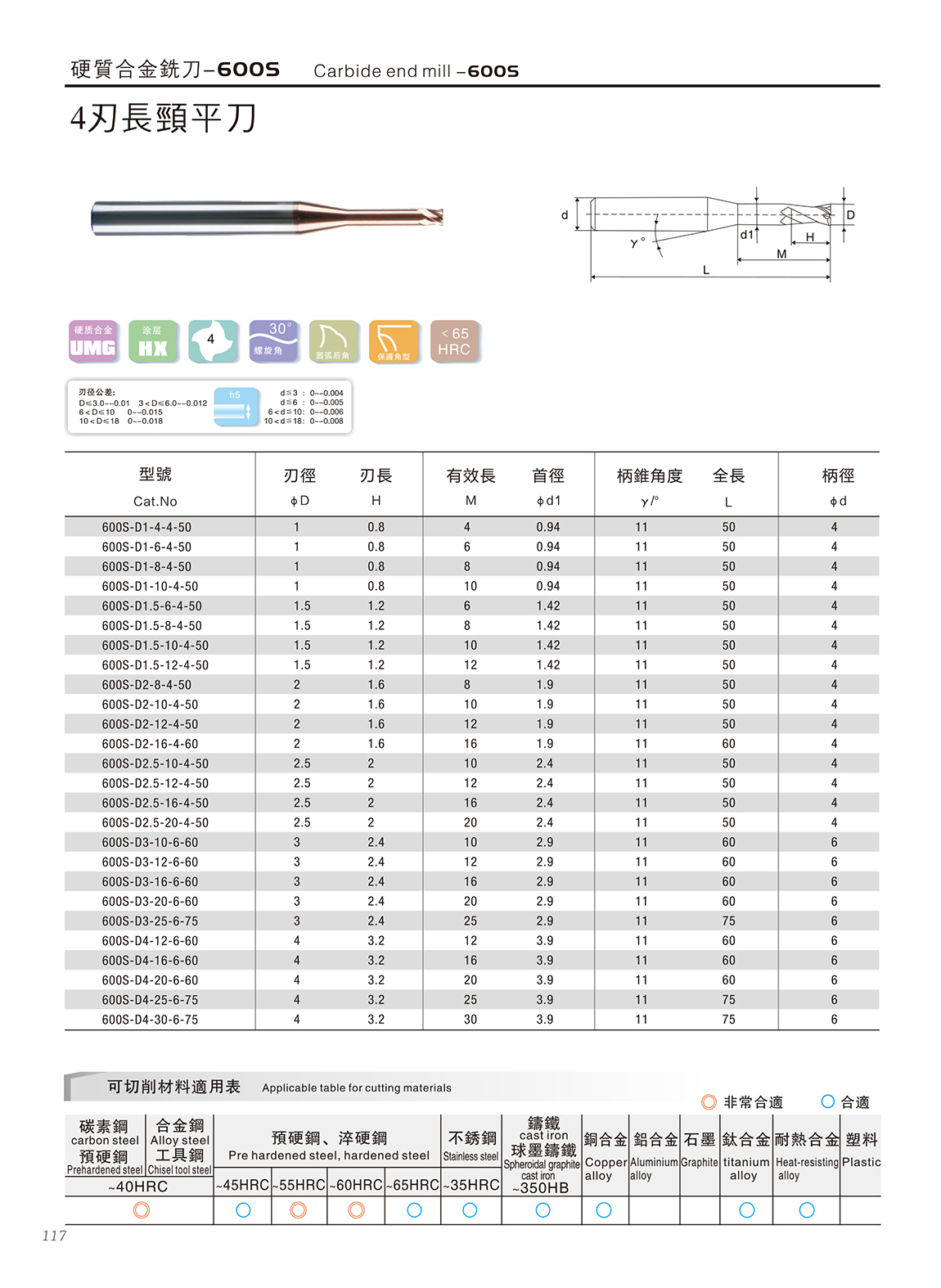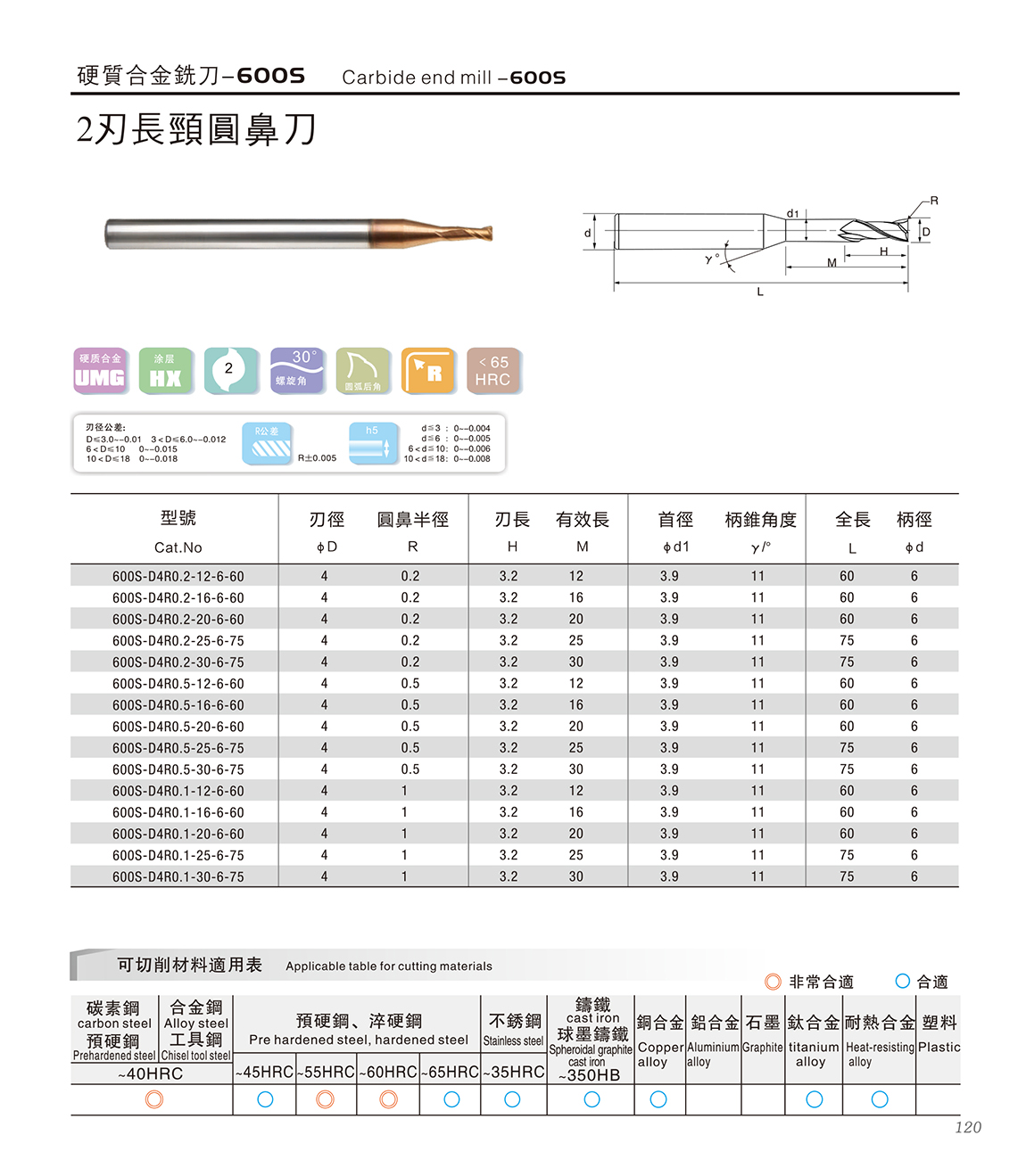 600S高速高硬度系列 600S特点: 1.采用03μm极细超微粒基体,具有超强的耐磨性 2.复合涂层与基体具有很好的结合力,功能层具备非常致密的结构,600S2系列涂层的耐高温和耐磨损能力大幅度提升,适合微润滑(油雾冷却)切削 3.非常适合加工HRC55~68之间的淬火钢、高合金材料等