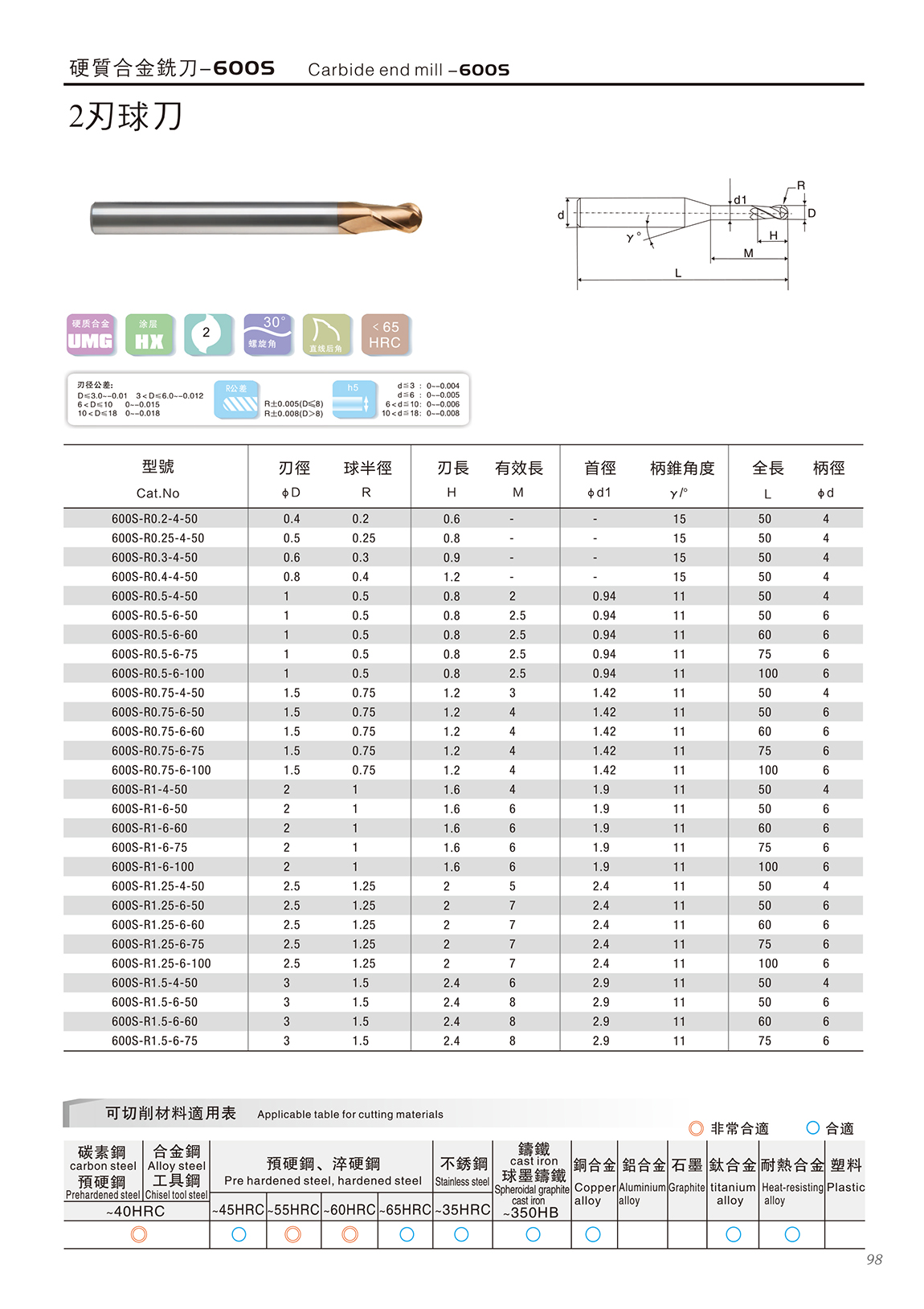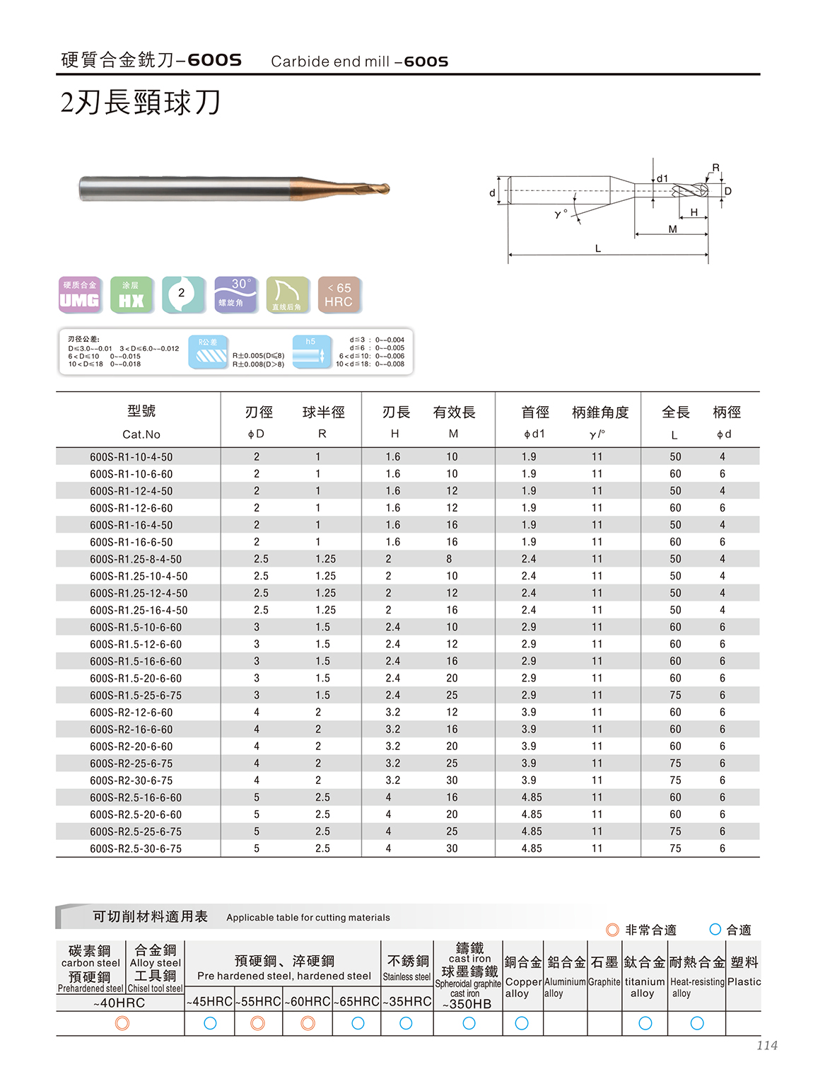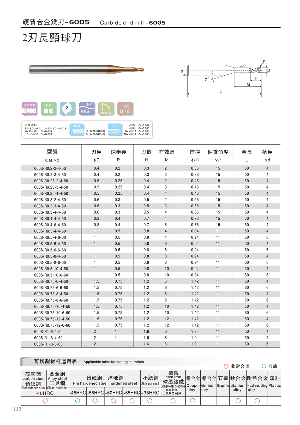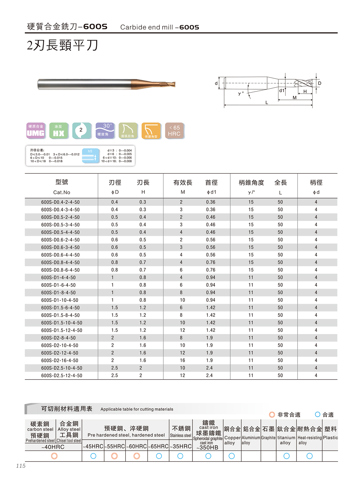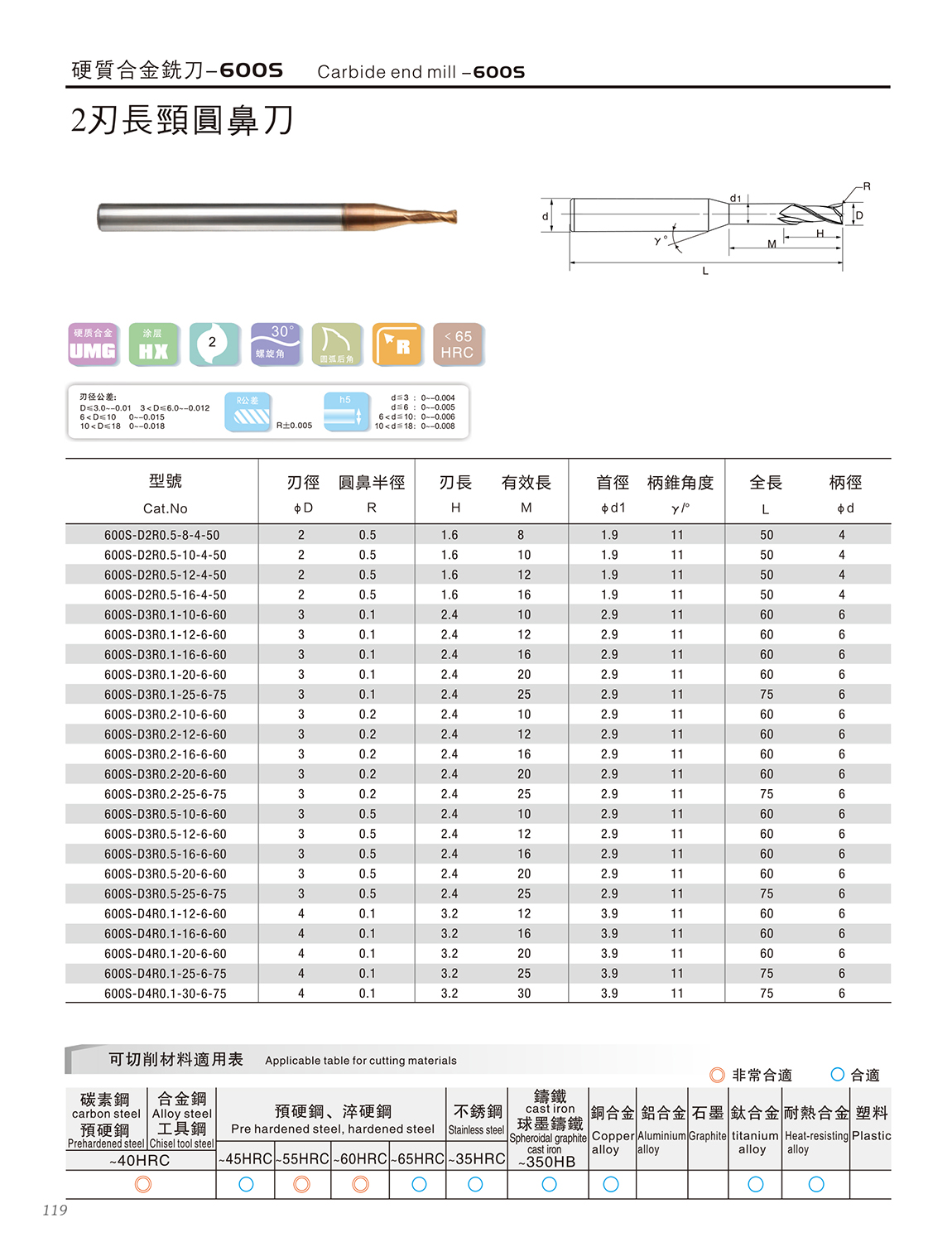 600S高速高硬度系列 600S特点: 1.采用03μm极细超微粒基体,具有超强的耐磨性 2.复合涂层与基体具有很好的结合力,功能层具备非常致密的结构,600S2系列涂层的耐高温和耐磨损能力大幅度提升,适合微润滑(油雾冷却)切削 3.非常适合加工HRC55~68之间的淬火钢、高合金材料等