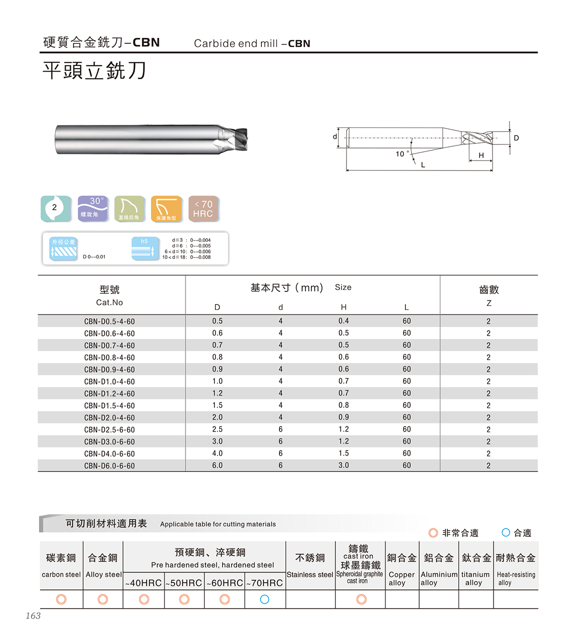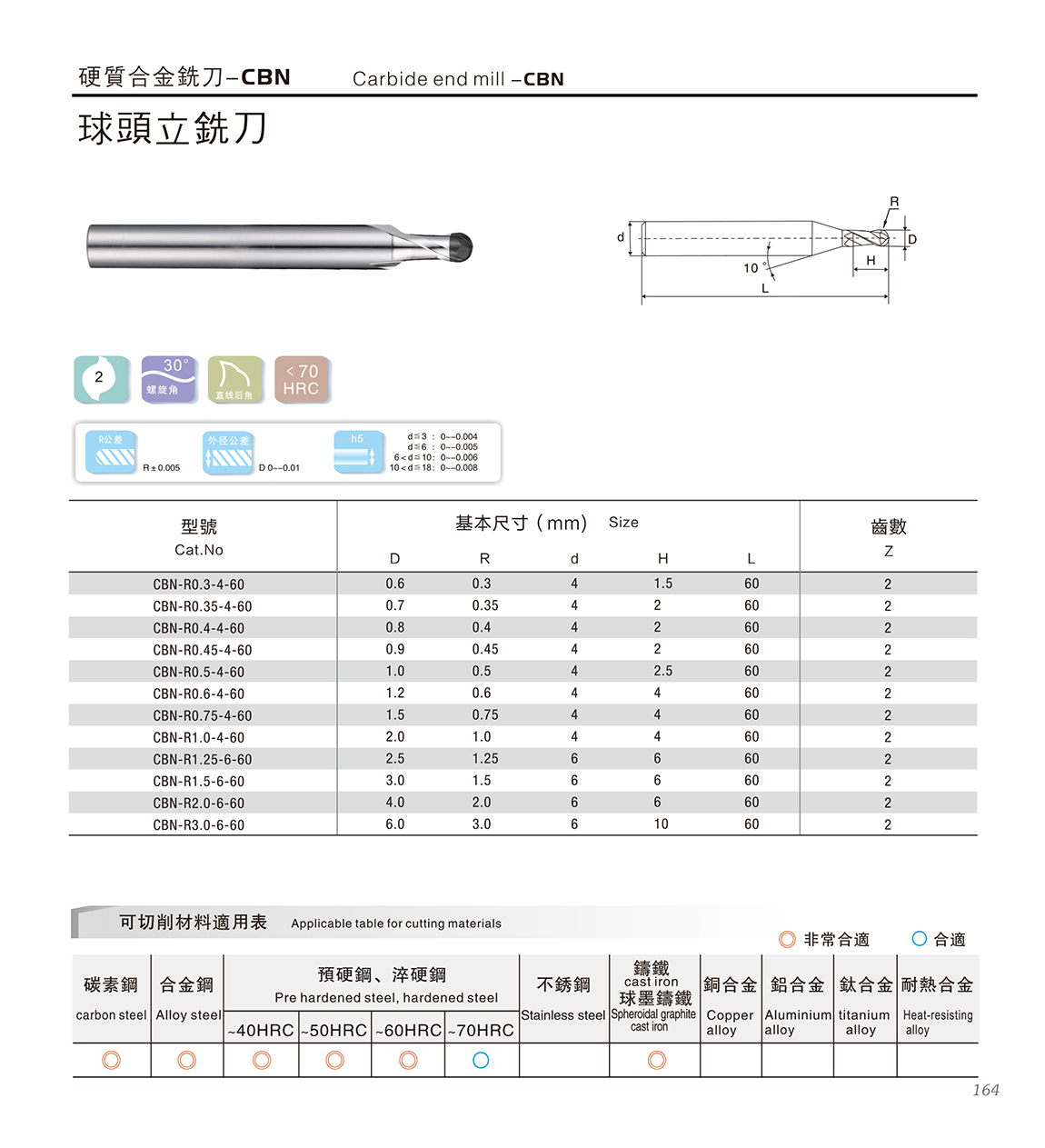 CBN铣刀适合加工 1:HRC30~70之间、陶瓷、碳素工具钢、合金钢轴承钢、高速钢等各类淬火钢; 2:热喷涂类镍Ni基、铁Fe基两大系列产品以及其它一些耐磨、耐热喷涂材料; 3:耐磨铸铁类、V-Ti铸铁、高磷铸铁和冷硬铸铁等。